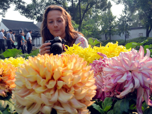 An expat visitor taking a picture of the chrysanthemums at Zhuozheng Garden, Suzhou, Jiangsu province, Sept 19, 2013. [Photo/Asianewsphoto.com]
