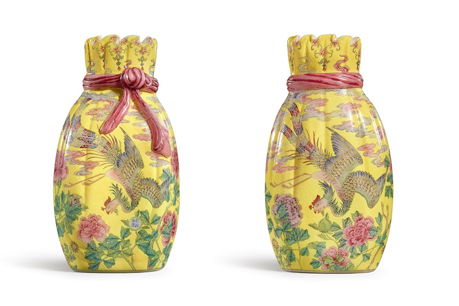 An enamel-coated glass vase made for Emperor Qianlong at the imperial workshops of the Qing Dynasty (1644-1911) is to be auctioned on Oct 8 by Sotheby's Hong Kong. The vividly-colored, richly-ornamented vase, standing about 18 centimeters tall, was modeled in the shape of a yellow pouch tied with a pink ribbon. And it depicts on both sides a flamboyant phoenix flying among colorful clouds and heading downward toward the blossoming flowers.