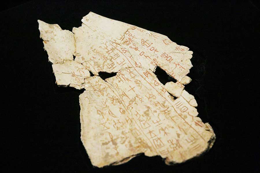 Oracle bones, bronze wares and jade objects dating back to late Shang (c.16th century-11th century BC) and Zhou (c.11th century-256 BC) dynasties are on show at the National Museum of China through Dec 22. [Photo by Jiang Dong/China Daily]
