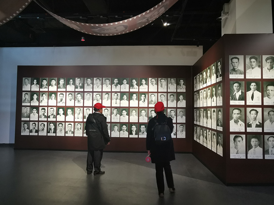 The wartime volunteers' descendants view pictures of those died in the brave move. [Photo by Wang Kaihao/China Daily]