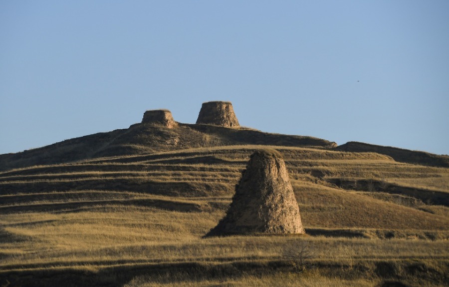 Photo taken on Oct 31, 2019 shows beacon towers of a section of the Great Wall built in Ming dynasty (1368-1644) in Qingshuihe county, Hohhot, capital of North China's Inner Mongolia autonomous region.[Photo/Xinhua]