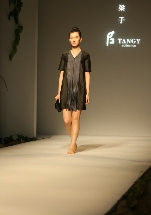 A model takes the runway at a fashion show featuring sustainable luxury brand TANGY Collection, founded by Liang Zi, during the unveiling ceremony of TANGY Silk Garden, the protection base for the national intangible cultural heritage gambiered Guangdong silk in Shunde district, Foshan, South China's Guangdong province, Nov 1, 2019. [Photo provided to chinadaily.com.cn]