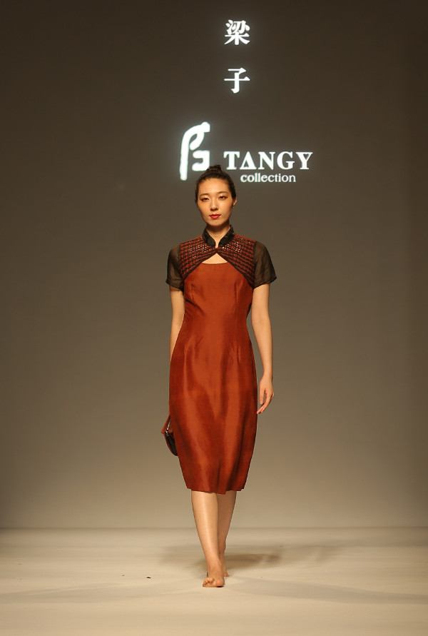 A model takes the runway at a fashion show featuring sustainable luxury brand TANGY Collection, founded by Liang Zi, during the unveiling ceremony of TANGY Silk Garden, the protection base for the national intangible cultural heritage gambiered Guangdong silk in Shunde district, Foshan, South China's Guangdong province, Nov 1, 2019. [Photo provided to chinadaily.com.cn] |