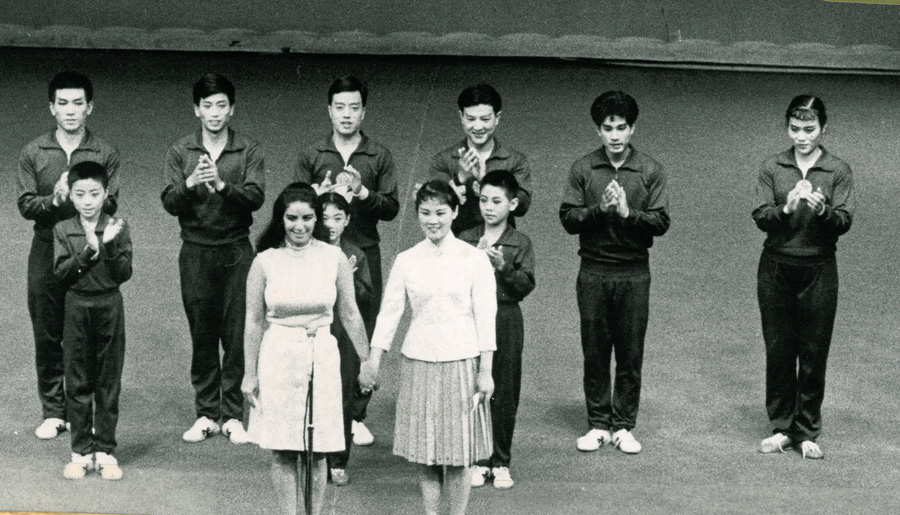 Jan Berris and a Chinese co-announcer during the Chinese Martial Arts Team's visit in the US in 1974 [Photo provided to China Daily]