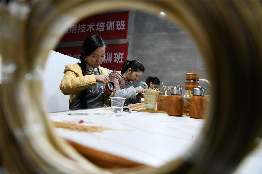 Yang Changqin teaches trainees the techniques of bamboo weaving at the training center in Chishui, Southwest China's Guizhou province, on Nov 12, 2019. [Photo/Xinhua]