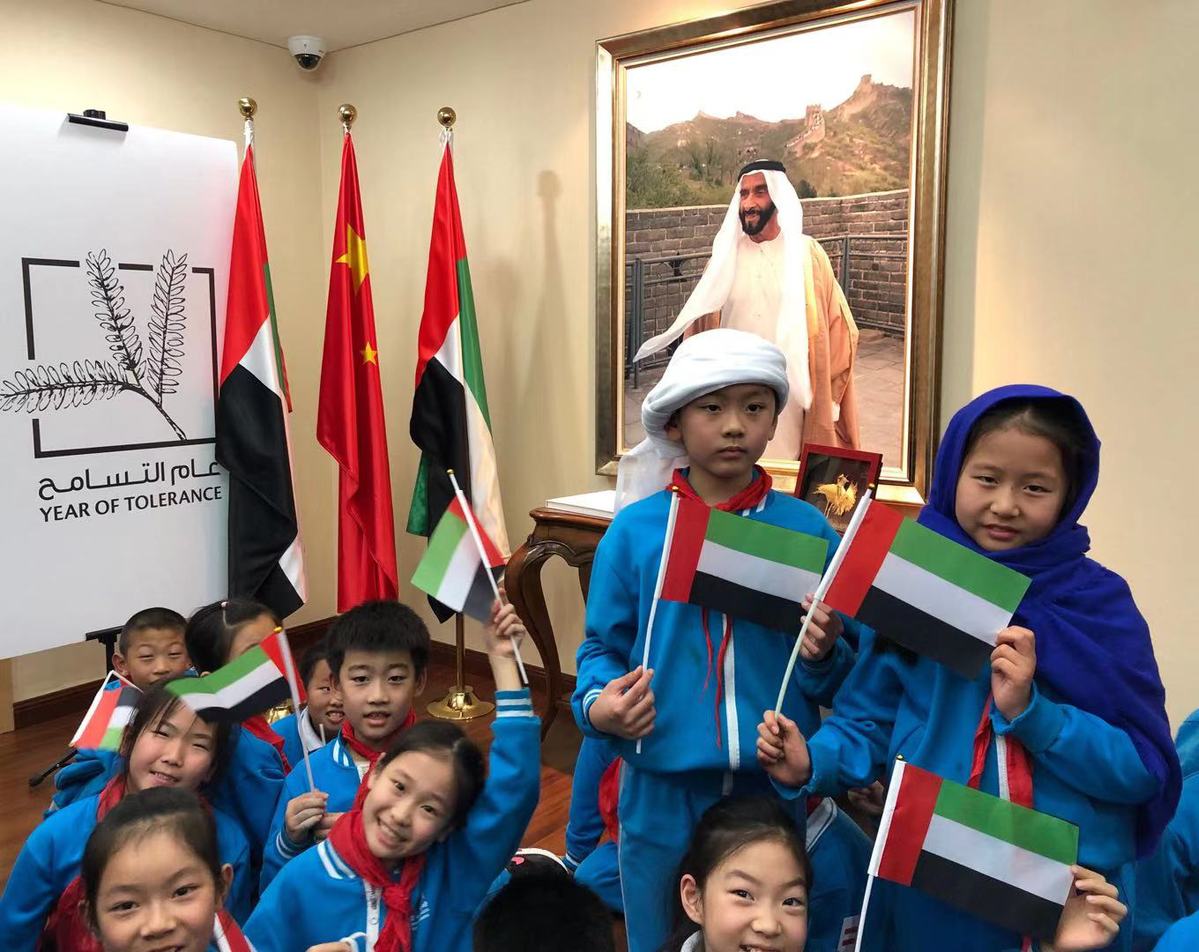 Students from Beijing Shijia Branch Primary School attend an event celebrating International Day for Tolerance hosted by the UAE Embassy to China on Nov 15, 2019. [Photo provided to chinadaily.com.cn]