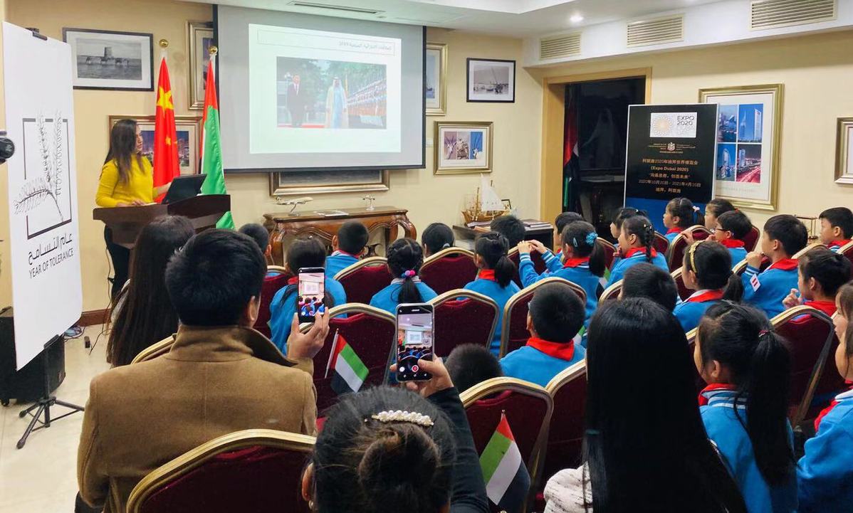 Students from Beijing Shijia Branch Primary School attend an event celebrating International Day for Tolerance hosted by the UAE Embassy to China on Nov 15, 2019. [Photo provided to chinadaily.com.cn]