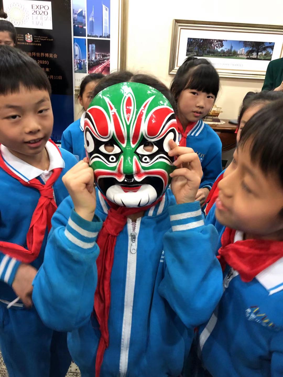 A student from Beijing Shijia Branch Primary School puts on a Beijing opera mask at an event hosted by the UAE Embassy to China to celebrate International Day for Tolerance. [Photo provided to chinadaily.com.cn]