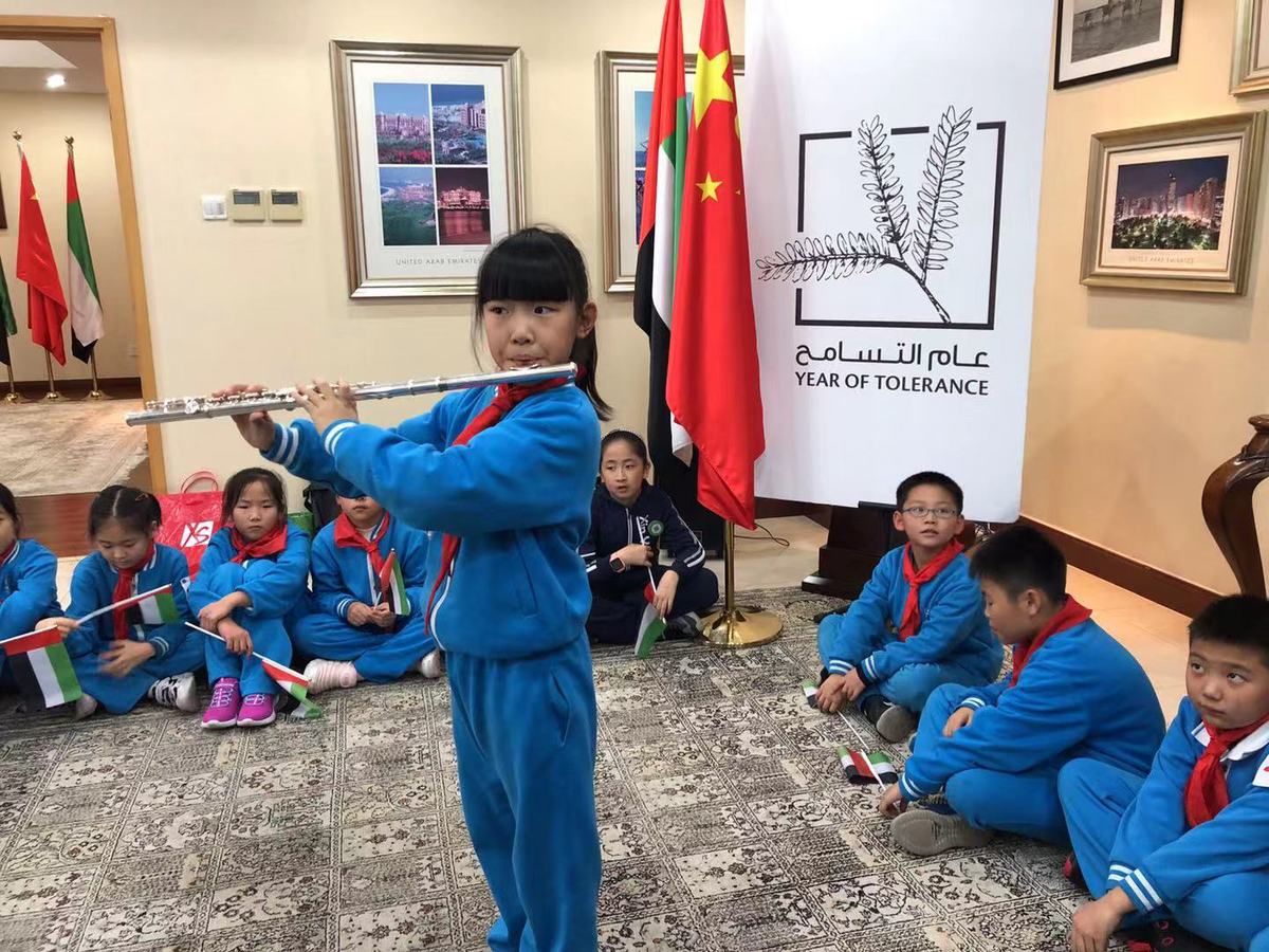 A student from Beijing Shijia Branch Primary School presents an instrumental performance at an event hosted by the UAE Embassy to China to celebrate International Day for Tolerance. [Photo provided to chinadaily.com.cn]