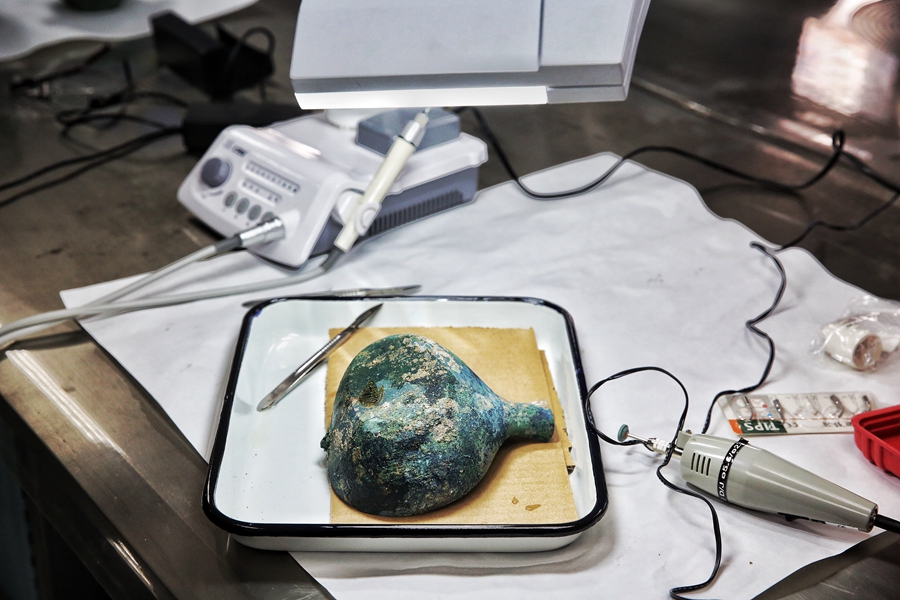 A bronze shell needs cleaning and rust removal. [Photo by Jiang Dong/China Daily] |