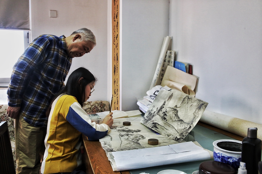Restorer Wang Qiuzhong and his apprentice Lyu Xuefei are working on a Chinese painting on Dec 3, 2019. [Photo by Jiang Dong/China Daily]