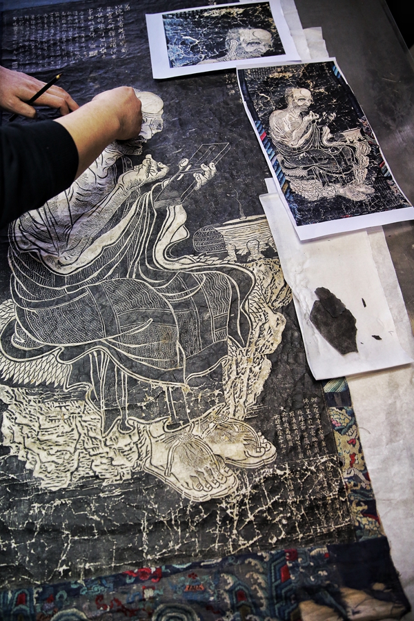 The restoration of a rubbing of an arhat in the 18th century from the Tibet Museum is completed on Dec 3, 2019. [Photo by Jiang Dong/China Daily]