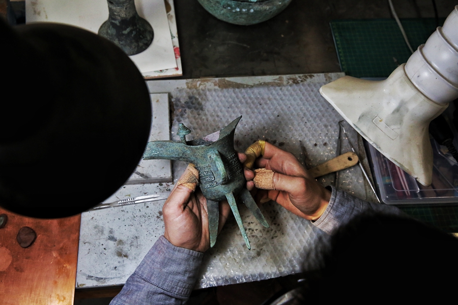 Restorer Ma Lizhi works on a bronzeware on Dec 3, 2019. [Photo by Jiang Dong/China Daily]