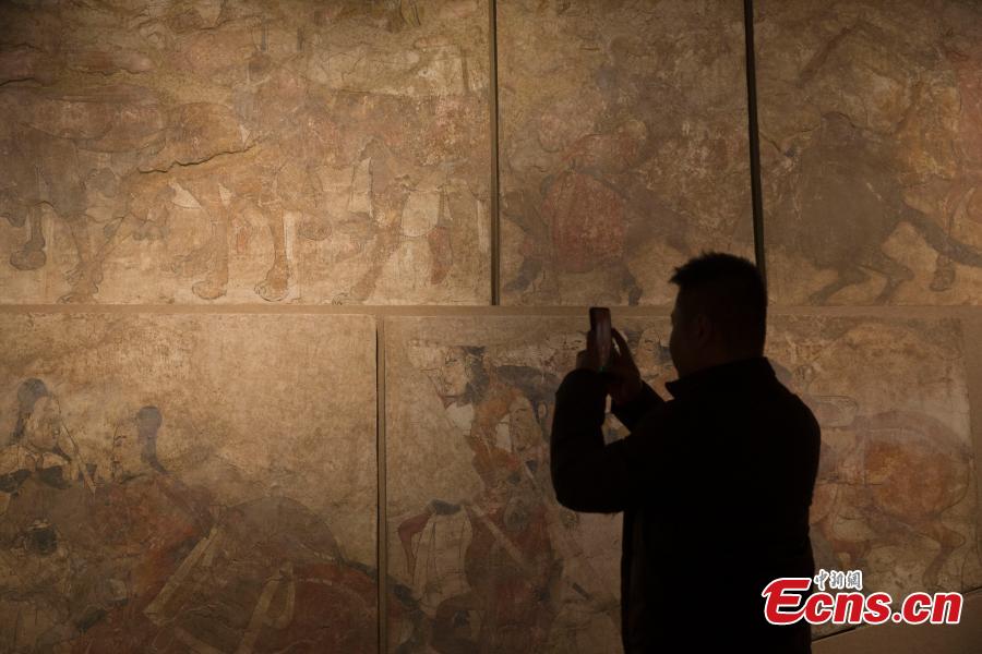 Some murals from three tombs dating back to the Northern Dynasties (386-581) are exhibited at Shanxi Museum in Taiyuan, capital of North China's Shanxi province, featuring illustrations of hunting activities as well as gods and spirits. Experts say the portrayal of a grand wooden building is the finest of all such depictions they have ever found in tombs from the late Northern Dynasties. The exhibition will last for three months. [Photo/China News Service] |