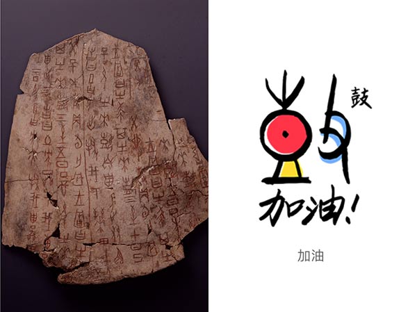 The photo on the left is a piece of oracle bone written with jiaguwen, the earliest known form of Chinese writing that dates back 3,000 years, while the photo on the right is a jiaguwen meme, meaning "add oil". [Photo/Xinhua]