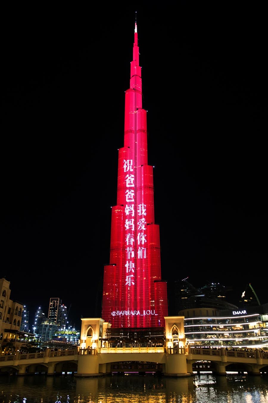 The Burj Khalifa in Dubai is illuminated on Feb 4 to welcome Lunar New Year. [PHOTO/XINHUA]