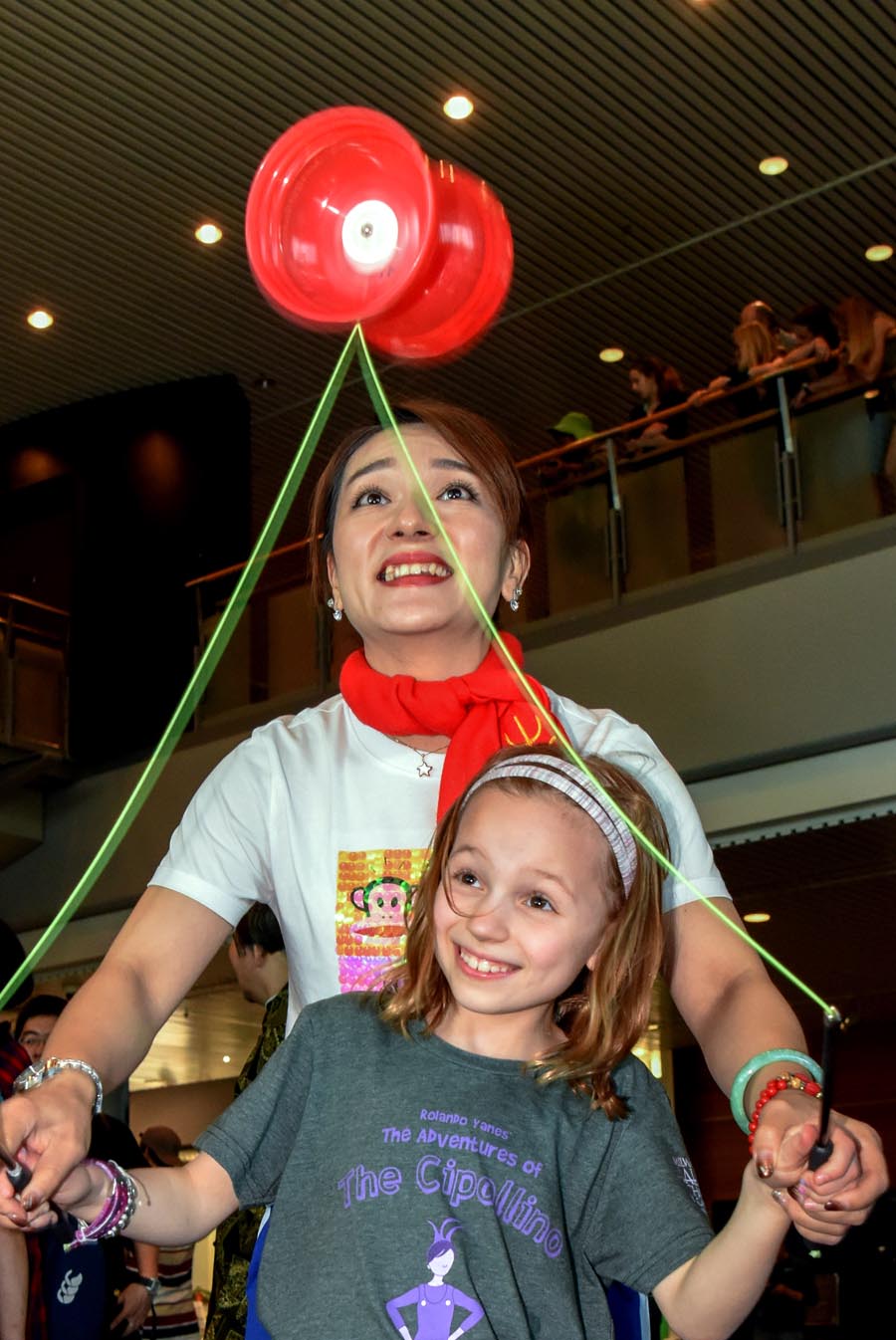 An actress of the Jinan Acrobatic Troupe plays the diabolo with a local girl at the Museum of New Zealand Te Papa Tongarewa in Wellington on Saturday. [PHOTO/XINHUA]