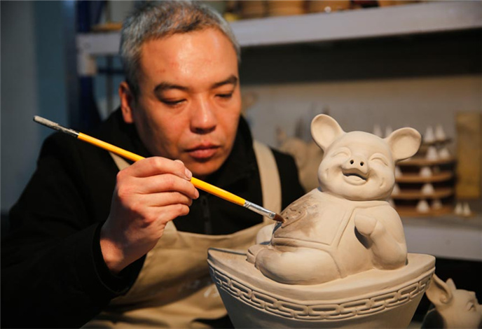 Craftsman Wang Guoqi works on the base of a Ru porcelain pig in Baofeng county, Pingdingshan city, Central China's Henan province, Jan 7, 2019. Wang is an inheritor of Ru porcelain, one of China's "five great kilns" in the Song Dynasty (960-1279).