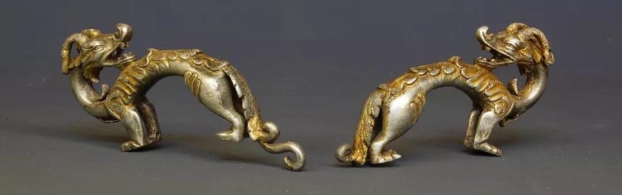 A pair of gilded silver dragons found in a 2,000-year-old Xiongnu graveyard in Mongolia. [Photo provided to China Daily]
