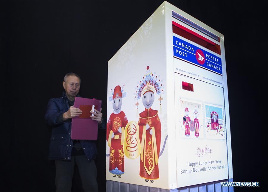 A man takes photos of the year of the Rat stamps-themed mailbox during the unveiling ceremony of the year of the Rat stamps at Chinese Cultural Centre of Greater Toronto in Toronto, Canada, Jan 16, 2020. [Photo/Xinhua]