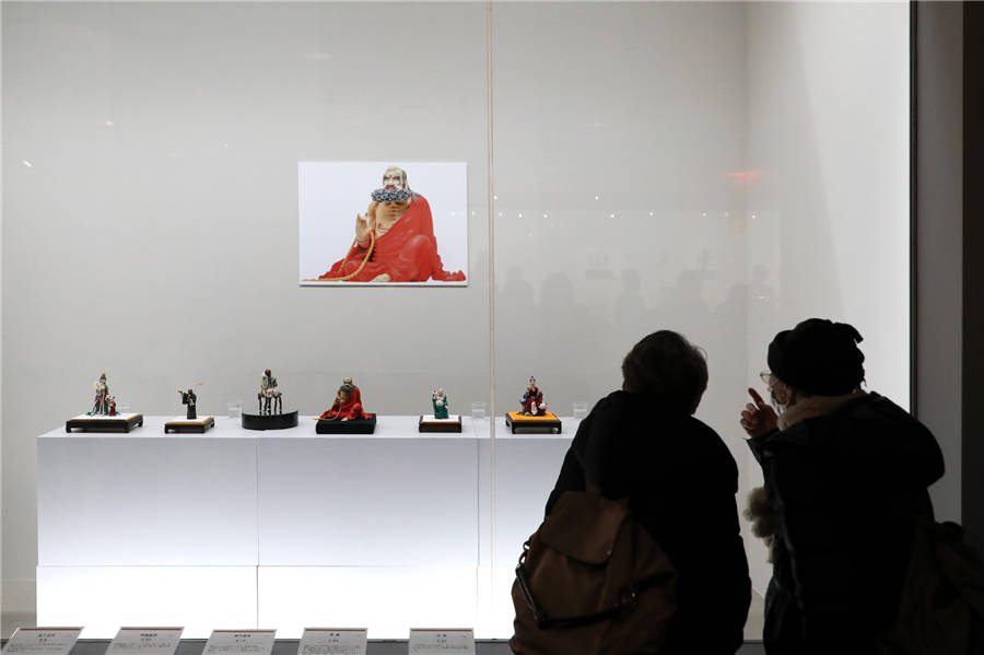 Photo taken on Jan 17, 2020 shows visitors enjoy dough modelling art works at the Chinese dough modelling exhibition in Tokyo, Japan. [Photo/Xinhua]