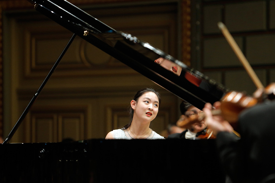 Chinese pianist Wang Yalun plays the piano with China Philharmonic Orchestra during a concert hosted by the Romanian Athenaeum in Bucharest, capital of Romania, Jan. 20, 2020. [Photo/Xinhua]