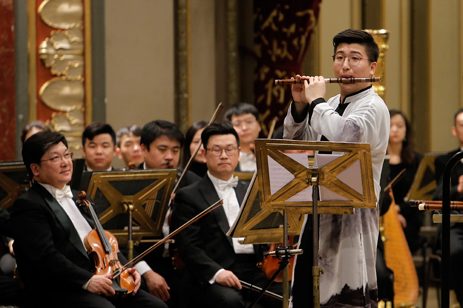 Bamboo flute player Wei Sijun performs with China Philharmonic Orchestra during a concert hosted by the Romanian Athenaeum in Bucharest, capital of Romania, Jan. 20, 2020. [Photo/Xinhua]