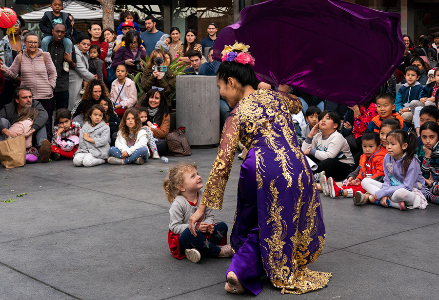 A performer interacts with a girl during Chinese Lunar New Year celebrations at the Farmers Market in Los Angeles, the United States, Jan. 26, 2020. [Photo/Xinhua]