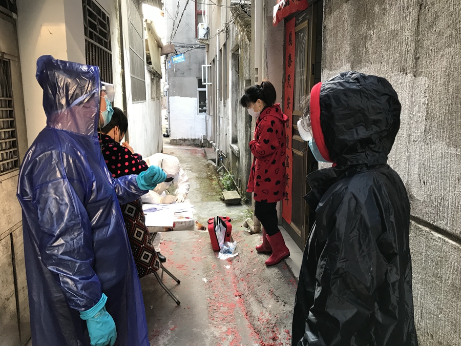 A team of workers organized by local cultural auditorium in Yuecheng subdistrict in Yueqing, Zhejiang province, check epidemic prevention in a local household on Jan 26.[Photo provided to China Daily]