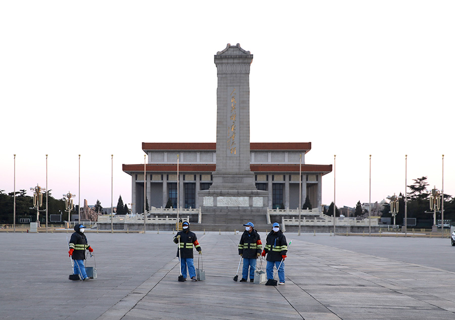 Sanitation workers clean the road at Tian'anmen Square in Beijing. [Photo by Zou Hong/China Daily]