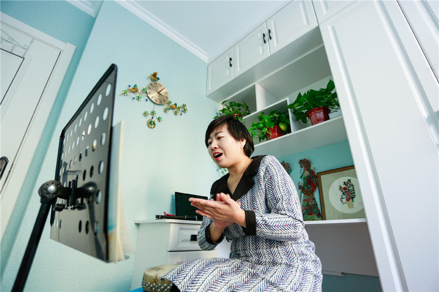 A teacher sings folk songs that are performed during a shadow puppet show in Luanzhou, North China's Hebei province, on March 15, 2020. [Photo/Xinhua]