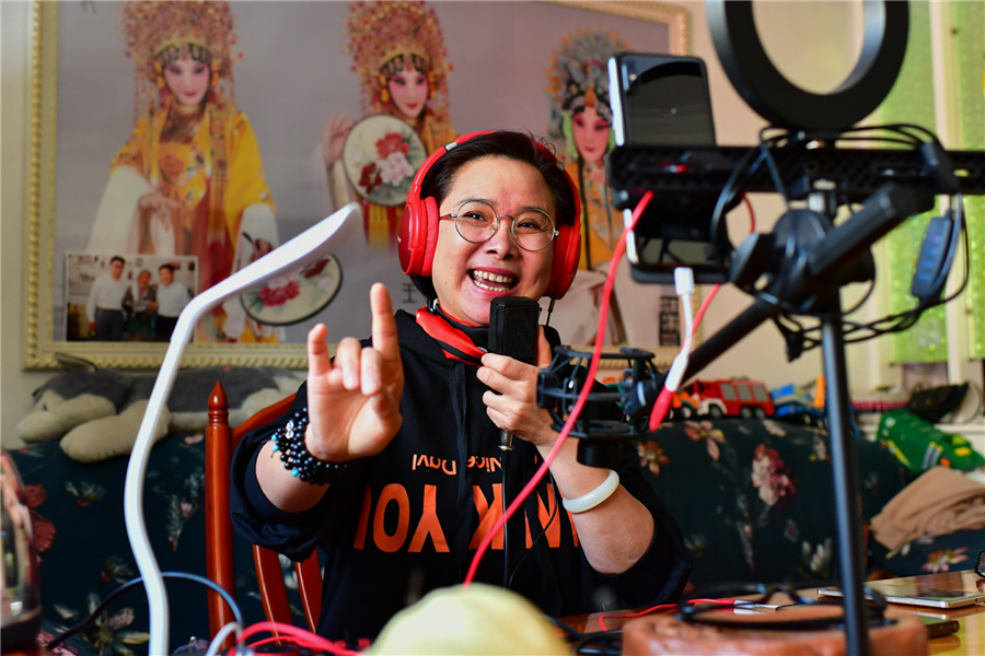 Wang Chunmei, Wu Lingyun's wife, performs Jin Opera through live stream. [Photo/Xinhua]