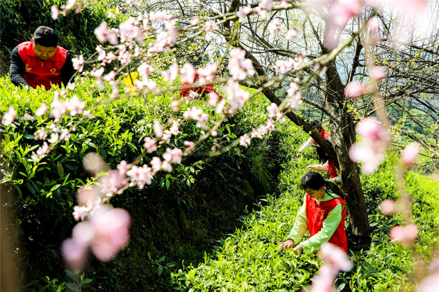 The tea harvest season has arrived around the Spring Equinox. In Jishou, Xiangxi Tu and Miao autonomous prefecture of Central China's Hunan province, tea growers pick fresh tea leaves from the garden, on March 19, 2020. [Photo by Liu Zhenjun/For chinadaily.com.cn]