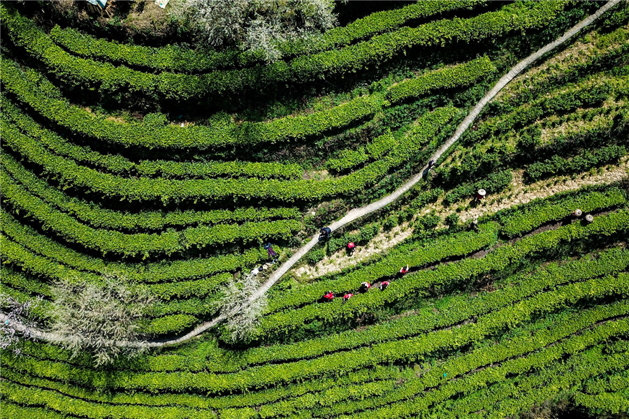 The tea harvest season has arrived around the Spring Equinox. In Jishou, Xiangxi Tu and Miao autonomous prefecture of Central China's Hunan province, tea growers pick fresh tea leaves from the garden, on March 19, 2020. [Photo by Liu Zhenjun/For chinadaily.com.cn]