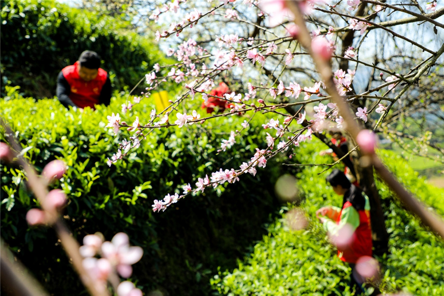 The tea harvest season has arrived around the Spring Equinox. In Jishou, Xiangxi Tu and Miao autonomous prefecture of Central China's Hunan province, tea growers pick fresh tea leaves from the garden, on March 19, 2020. [Photo by Liu Zhenjun/For chinadaily.com.cn]