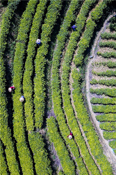 The tea harvest season has arrived around the Spring Equinox. In Jishou, Xiangxi Tu and Miao autonomous prefecture of Central China's Hunan province, tea growers pick fresh tea leaves from the garden, on March 19, 2020. [Photo by Liu Zhenjun/For chinadaily.com.cn]