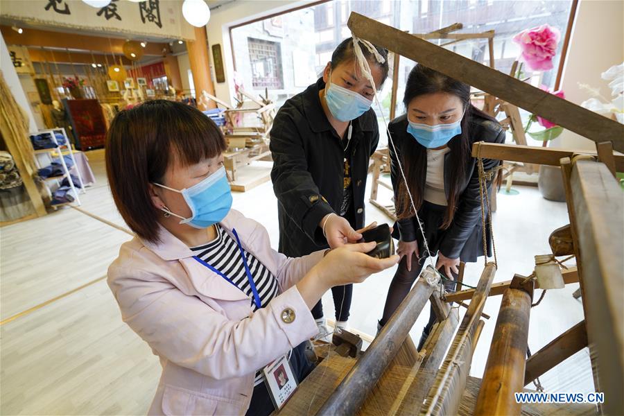 Inheritor Yan Xianying (left) demonstrates as two learners observe to make Rongchang Grass Linen, also called Rongchang Xiabu, at a workshop in Rongchang district of Chongqing, Southwest China, March 23, 2020. [Photo/Xinhua]