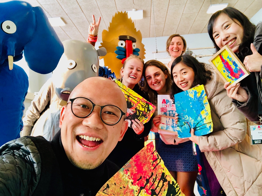 William Yip, 43, a Beijing-based Hong Kong drama director and educator, takes part in an arts festival held in Hjorring, Denmark, in 2019, mixing with his students and international friends.[Photo provided to China Daily] |