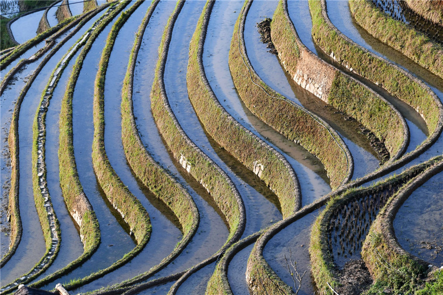 Located deep in the mountains of Congjiang county, Southwest China's Guizhou province, the irrigated terraced fields indicate a good sign for spring farming, on April 1, 2020. [Photo/Xinhua]