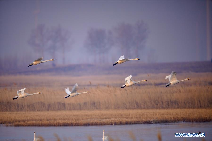 Swans fly over the wetland in Momoge National Nature Reserve in Zhenlai county, Baicheng city of Northeast China's Jilin province, April 9, 2020. [Photo/Xinhua]