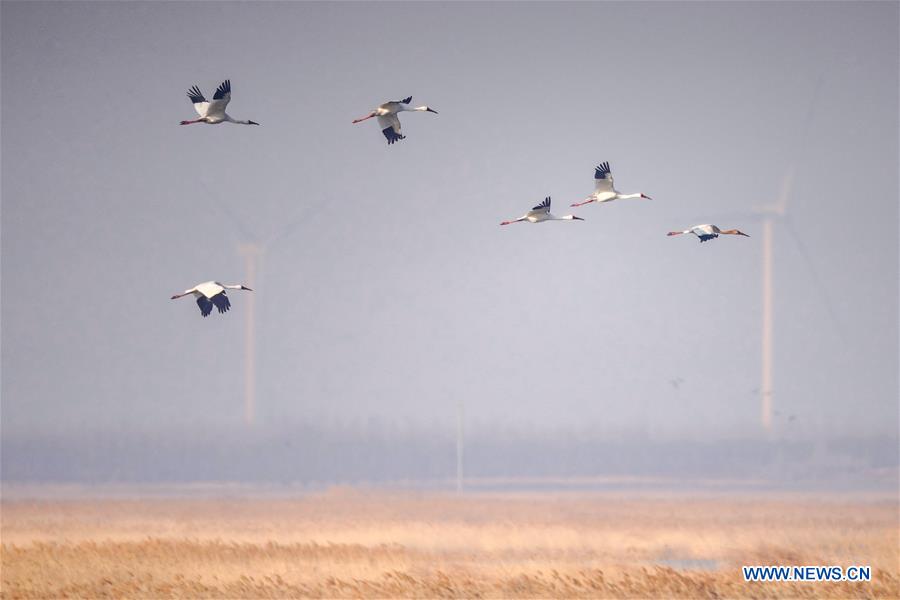 White cranes fly over the wetland in Momoge National Nature Reserve in Zhenlai county, Baicheng city of Northeast China's Jilin province, April 9, 2020. [Photo/Xinhua]