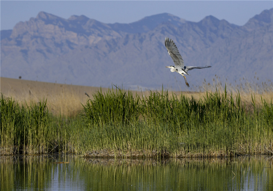 Migratory birds are spotted at the Sand Lake scenic area in Shizuishan, Northwest China's Ningxia Hui autonomous region. From March to October, the region becomes a sanctuary for many species such as sandpipers, herons and pochards. The 9th International Bird Watching Festival will begin during the Labor Day holiday. [Photo/Xinhua]