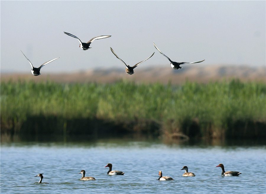 Migratory birds are spotted at the Sand Lake scenic area in Shizuishan, Northwest China's Ningxia Hui autonomous region. From March to October, the region becomes a sanctuary for many species such as sandpipers, herons and pochards. The 9th International Bird Watching Festival will begin during the Labor Day holiday. [Photo/Xinhua]