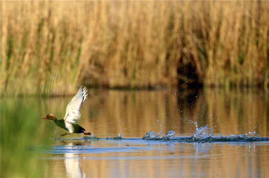 Migratory birds are spotted at the Sand Lake scenic area in Shizuishan, Northwest China's Ningxia Hui autonomous region. From March to October, the region becomes a sanctuary for many species such as sandpipers, herons and pochards. The 9th International Bird Watching Festival will begin during the Labor Day holiday. [Photo/Xinhua]