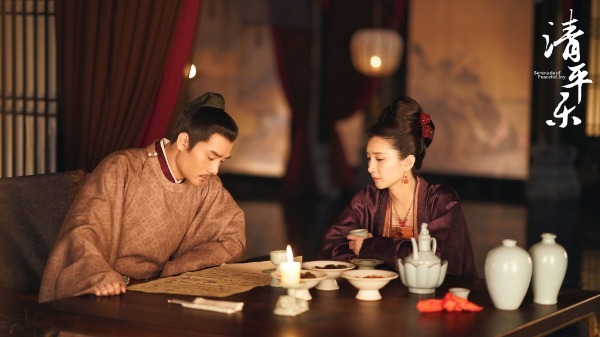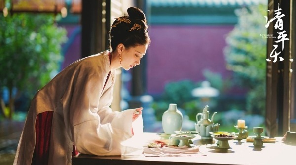 A still from Serenade of Peaceful Joy features a lotus-shaped wine-warming bowl, a wine ewer, plates and candle holders, which are all celadon. [Photo/douban.com] |