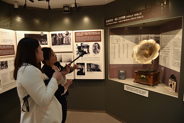 A guide at the Memorial Museum of Lao She joins an online host in a livestreaming program in Beijing on Saturday. [Photo/Xinhua] |
