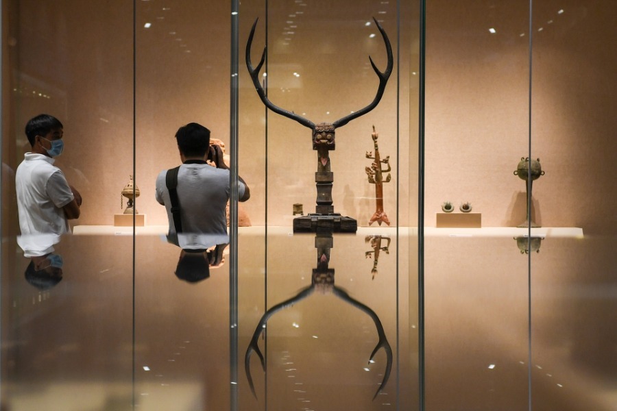 A journalist takes photos of the exhibits during a special exhibition with a selection of cultural relics dating from the Spring and Autumn Period (770-476 BC) to the Qin and Han Dynasty (221 BC-220 AD) at the Nanjing Museum in Nanjing, East China's Jiangsu province, May 17, 2020. The special exhibition will kick off on May 18.[Photo/Xinhua]