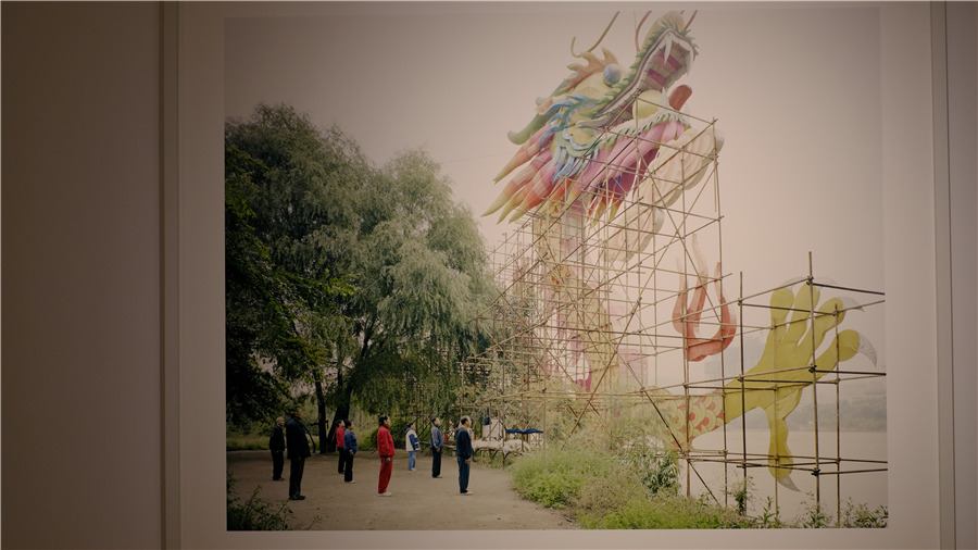 Chinese artist Zhang Kechun's photograph, People Doing Morning Exercise Under a Dragon Lamp, is on show at the Today Art Museum in Beijing on May 16, 2020. [Photo by Yang Xiaoyu/chinadaily.com.cn]