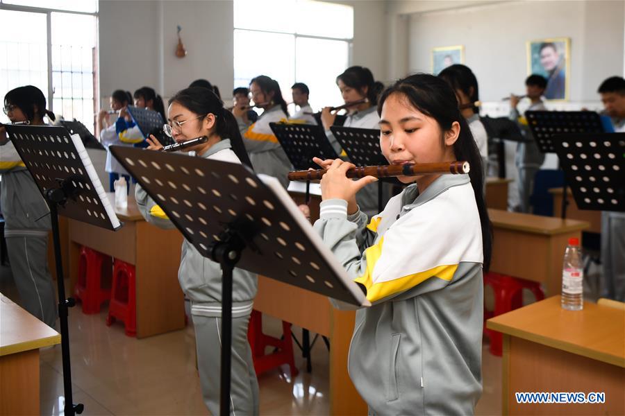 Students practice playing the flutes at the No. 5 Middle School in Wuxi Town of Luxi County in Xiangxi Tujia and Miao autonomous prefecture, Central China's Hunan province, May 22, 2020. The school has set up various art courses free of charge since 2006 to help cultivate rural students' interest in art.[Photo/Xinhua]