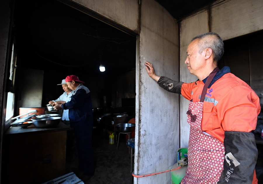 Chef Yang Yunming watches the workers take away their meals.[Photo/Xinhua]